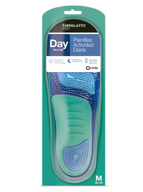 Las plantillas Day Farmalastic Feet ayudan a absorber los impactos de forma eficaz y a reducir la presión que los pies soportan a lo largo del día. Proporcionan mayor estabilidad y soporte en el arco plantar y amortiguación en metatarso y talón. Producto no sanitario.